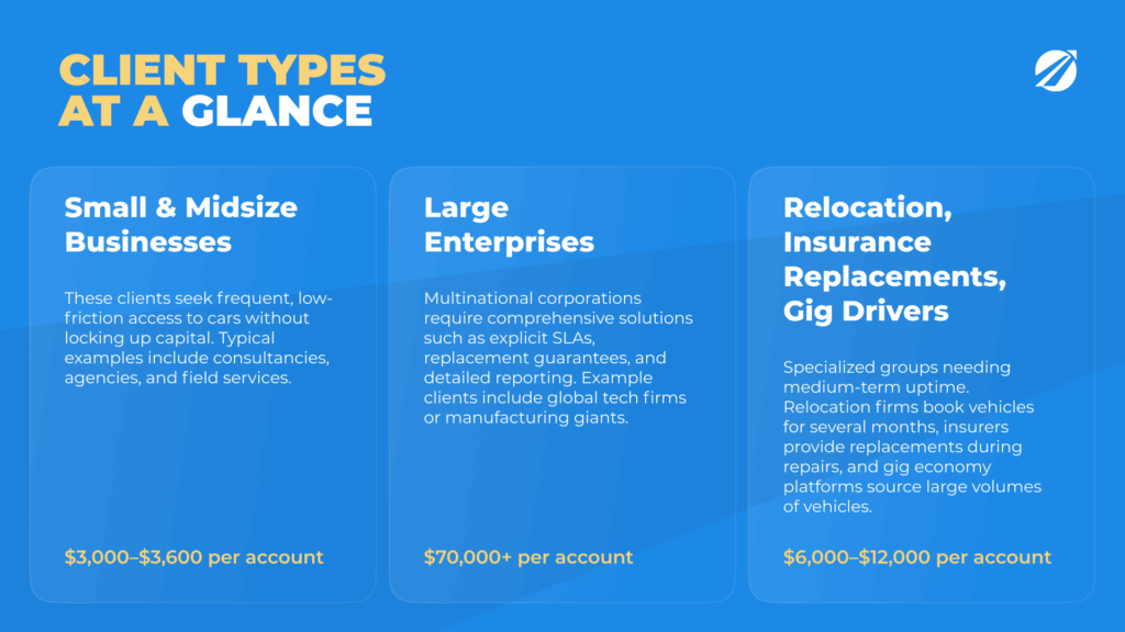 Small and mid-size businesses — agencies, field service firms, clinics, installers, regional sales teams — need frequent, low-friction access to cars without tying up capital. A 40-person consultancy that books a dozen trips a month will gladly trade counter negotiations for a fixed corporate rate, guaranteed availability, and one clean invoice. For the operator, that can mean something like $3,000–$3,600 recurring revenue each month from a single client, with far fewer operational touchpoints than the equivalent number of retail bookings.