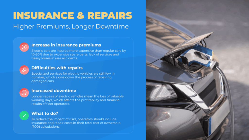 For rental companies, this translates into both higher premiums and higher out-of-pocket costs when incidents occur. Some insurers are beginning to offer specialized EV policies, but pricing remains volatile. Fleet managers must include these expenses in TCO analyses and explore risk-reduction measures like telematics or driver training.