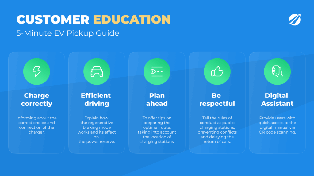 Staff must be confident explaining EV basics: charging connectors, regenerative braking, driving dynamics. Customers should receive a short briefing at pickup, plus digital guides via QR code or app. Fewer complaints and accidents through training translate into happier customers.