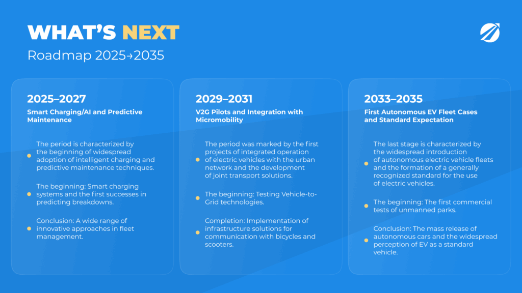 Autonomous EV Fleets. By the 2030s, autonomous driving may converge with electrification. Autonomous EV fleets offer the potential for near-continuous operation, slashing both downtime and labor overhead. While widespread deployment is still years away, operators should monitor developments closely.