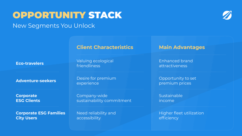 Corporate clients may be the most strategic opportunity. Companies in high-value sectors — from IT to banking to consulting — are pushing employees toward low-emission mobility. This is not just a symbolic gesture — it ties directly into ESG reporting obligations. A Fortune 500 company signing a multi-year contract with a rental provider will look closely at the availability of EVs. In the U.S., one rental firm won a multi-million-dollar deal by pledging that 30% of its fleet would be EVs. For the operator, this delivered stable demand, reliable revenues, and a reinforced client bond.