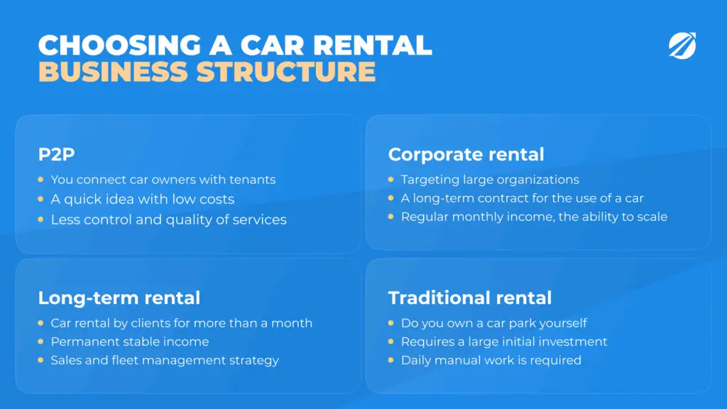 The peer-to-peer (P2P) model is leaner on capital. You bring car owners and renters together and take a commission on each deal. Since you don’t possess the vehicles yourself, you have lower costs but also more limited quality and availability control. This option is favorite among newcomer entrepreneurs wanting to try things out before purchasing their own fleet.