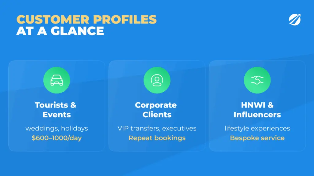 Companies may rent premium vehicles for executive transport, incentives, company events, and VIP airport transfers. This segment can provide repeat bookings (especially for event management firms, MICE, and incentive travel agencies). Because budgets are higher, the rate tolerance is better, yet service and reliability demands are likewise higher.