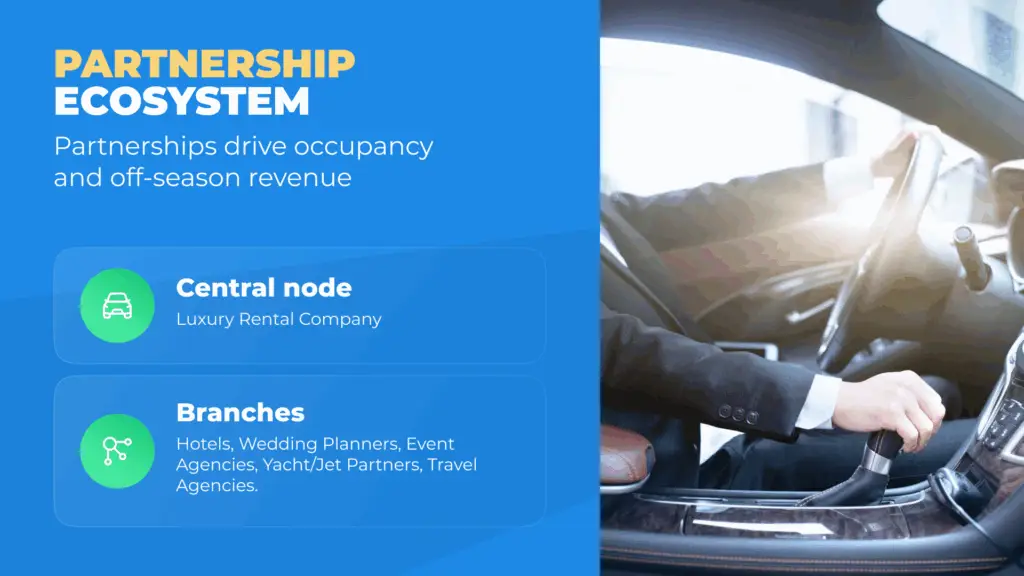 Luxury rentals fit well into partnerships with luxury hotels, event planners, wedding agencies, and luxury lifestyle services (yachts, private jets). For example, a hotel concierge can recommend your premium car as part of a VIP guest offering; a wedding planner can bundle a convertible sports car with the event package. These partnerships expand your reach beyond standard tourism channels and help fill low-season inventory when travel demand is lower.