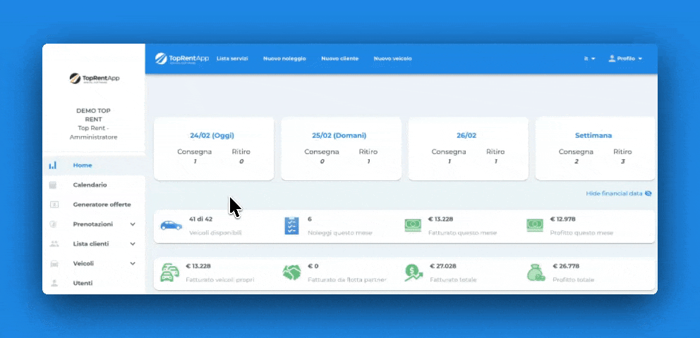 All’interno di TopRentApp selezioni le date di noleggio e il veicolo, aggiungi eventuali extra, verifichi il dettaglio dei prezzi e generi una proposta strutturata — tutto in un unico flusso di lavoro integrato. La disponibilità viene verificata automaticamente e il veicolo viene bloccato solo dopo la conversione dell’offerta in prenotazione.