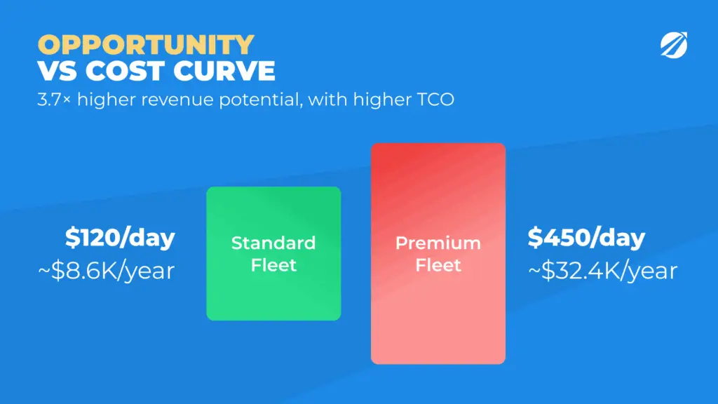 Poiché i veicoli di lusso comportano costi di acquisizione e un’attrattiva del marchio molto più alti, possono raggiungere ADR (tariffe giornaliere medie) nettamente superiori. Ad esempio, se la tua flotta standard genera in media 120 USD/giorno con un tasso di utilizzo del 60% (72 giorni all’anno in una stagione di 120 giorni), il ricavo per veicolo è di circa 8.640 USD/anno. Al contrario, un veicolo di lusso a 450 USD/giorno con lo stesso tasso di utilizzo (72 giorni) porta a un ricavo annuo di 32.400 USD.