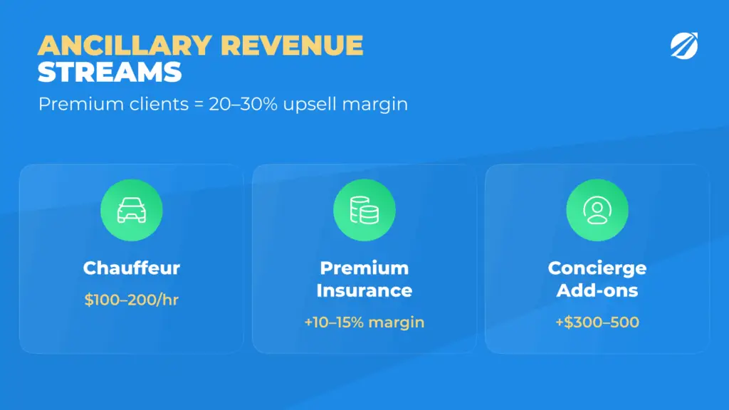 I clienti premium sono più propensi agli upsell: servizi con autista, pacchetti assicurativi avanzati, extra personalizzati da concierge (es. trasferimenti aeroportuali esclusivi, branding personalizzato sul veicolo, tour panoramici guidati). Questi extra spesso garantiscono margini elevati: ad esempio, un servizio con autista a 100–200 USD/ora o un upgrade assicurativo premium con franchigia ridotta può ridurre il rischio economico per l’operatore.