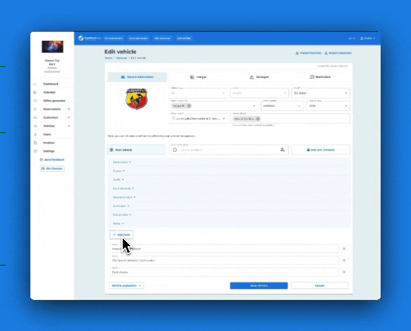 Le note vengono salvate insieme alle altre modifiche del veicolo facendo clic su Salva Veicolo.